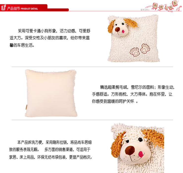 卡比抱枕采用可爱卡通小狗形象,活力动感,可爱舒适大方。深受女性及小朋友的喜欢,给你带来温馨的车居生活。