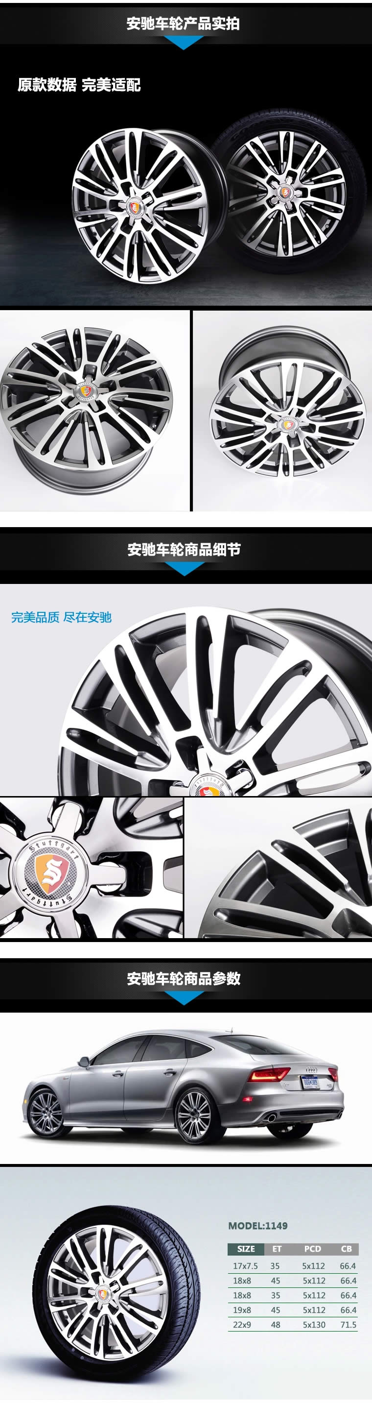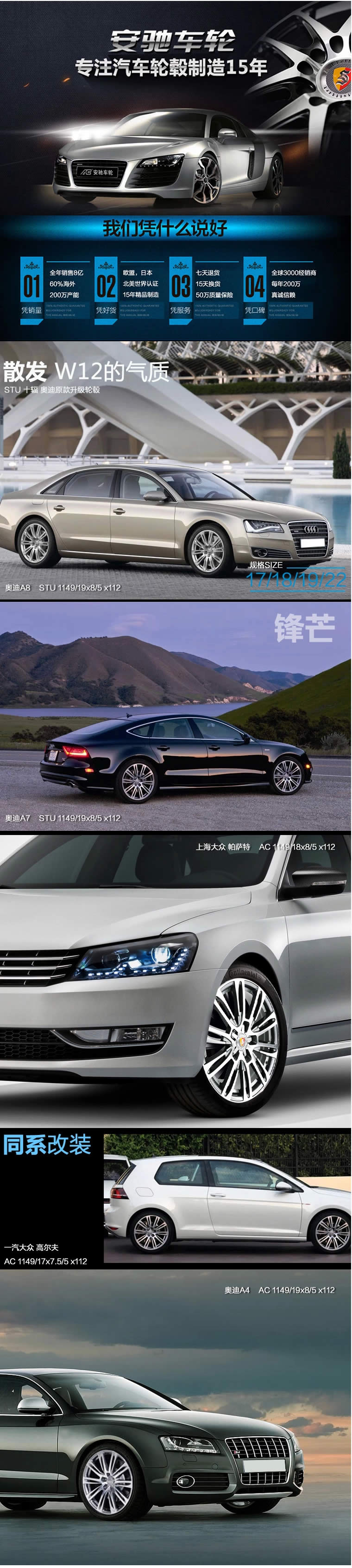 适合大众系列,奥迪A4/A6/Q3/Q5/Q7.轮毂为定制产品,下单后需7天左右到货。