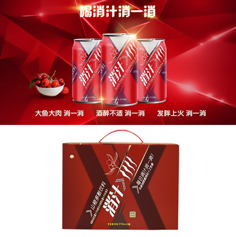 汽车美容 >微信活动> 消汁 山楂多酚饮料 310ml*12罐 整箱 (每个用户只限一件,下单时请选择到店自提,此产品不做配送,敬请您谅解!)