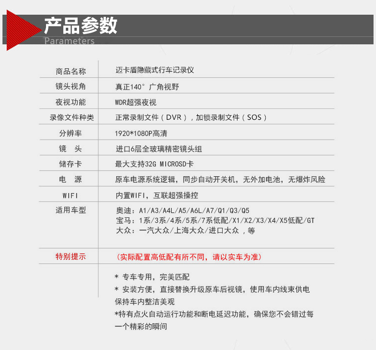 上门服务类 >安装服务> 行车记录仪> 迈卡盾 隐藏式行车记录仪 140°广角 1080P画质 专车专用
