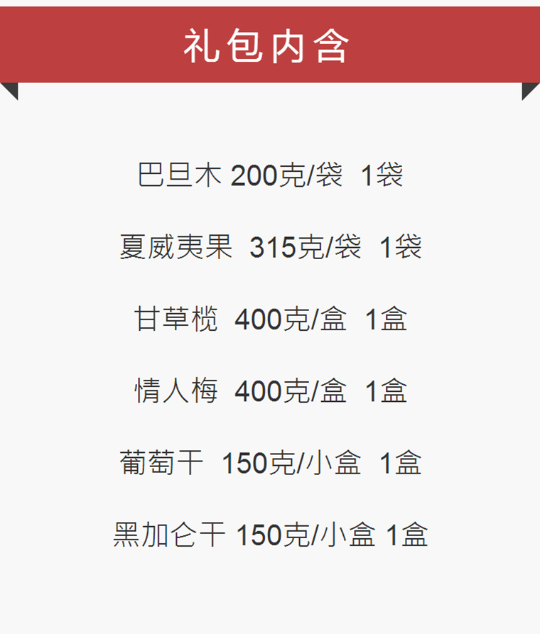 【巴旦木1袋、夏威夷果1袋、甘草榄1盒、情人梅1盒、葡萄干1盒、黑加仑干1盒】(此商品仅适用于成都范围)