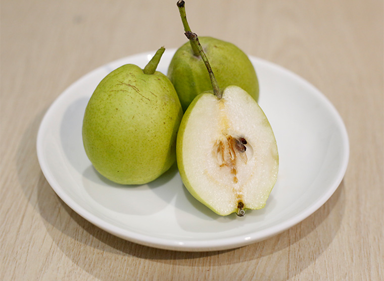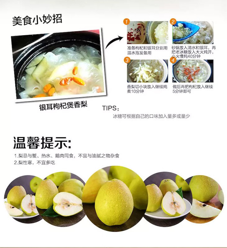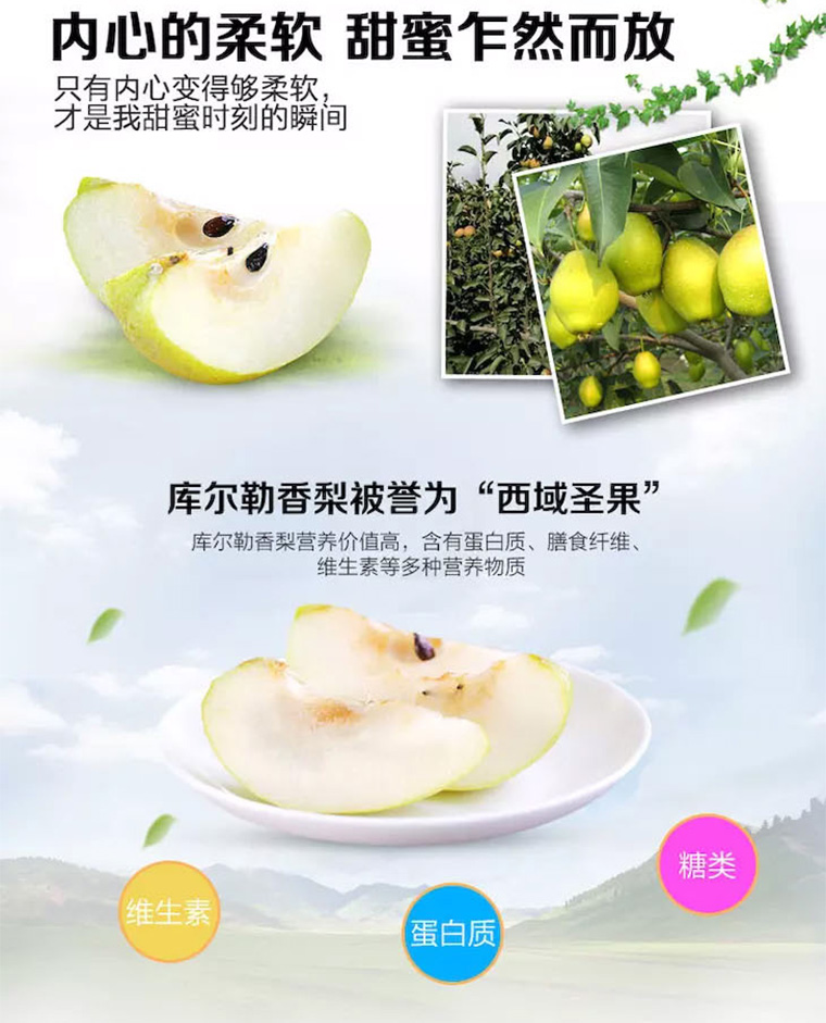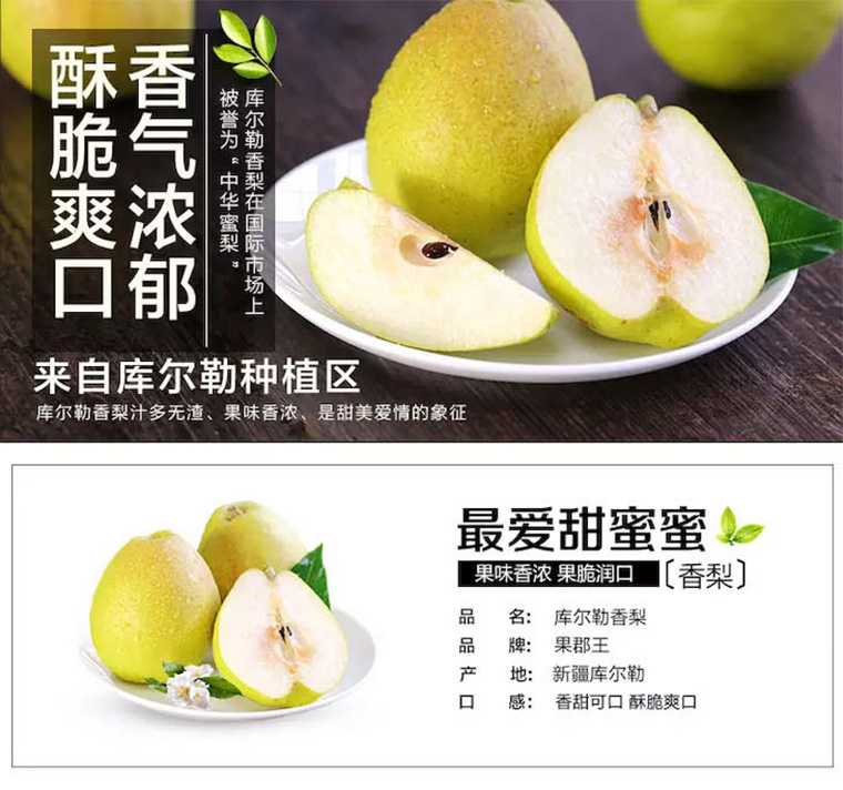 香梨果皮薄,质脆,果肉白色,肉质细嫩,石细胞少,坚硬,多汁味甜,近果心处略酸,香味浓郁