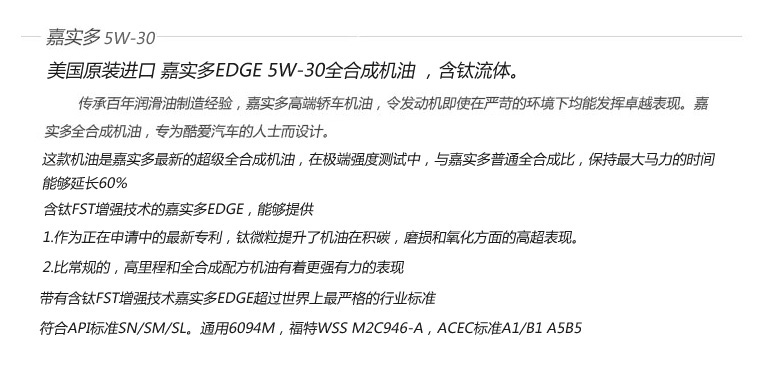 服务包含:嘉实多全合成含钛机油SN 5W30(1QT) 5瓶,品牌专用机油格。